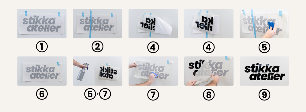 8) Retirez délicatement et à plat le papier transfert, le vinyle doit rester collé sur le support de pose. Si vous avez utilisé de l'eau, attendez 15-30 min avant de retirer le papier transfert, car le vinyle n'est pas encore collé sur le support de pose et risque d'être retiré avec le papier transfert.